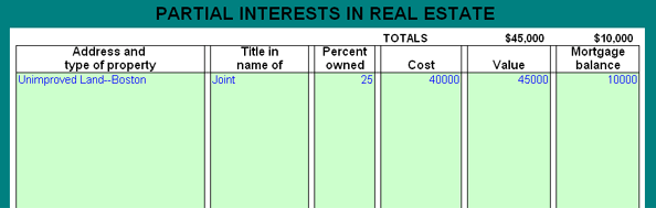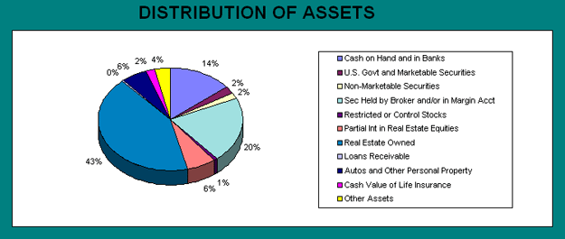 • Net Worth considers: Cash on Hand and In Bank, Notes Payable, Marketable Securities, Non-Marketable Securities, Securities Held by Brokers, Restricted or Control Stocks, Partial Real Estate Interests, Owned Real Estate, Loans Receivable, Life Insurance, Other Assets, Accounts Payable, Amount Due to Brokers, Unpaid Income Taxes, Other Unpaid Taxes/Interest, Other Debts, Debt on Real Estate Equities, and Real Estate Mortgages.