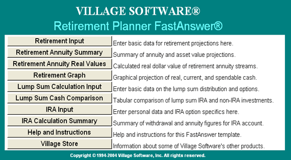 Use Retirement Planner to determine exactly how much you need to save to meet your retirement goals and maintain a comfortable standard of living. Along with 401(k) Forecaster, Village Software's Retirement Planner provides one of the best one-two punches in your fight for a good retirement!