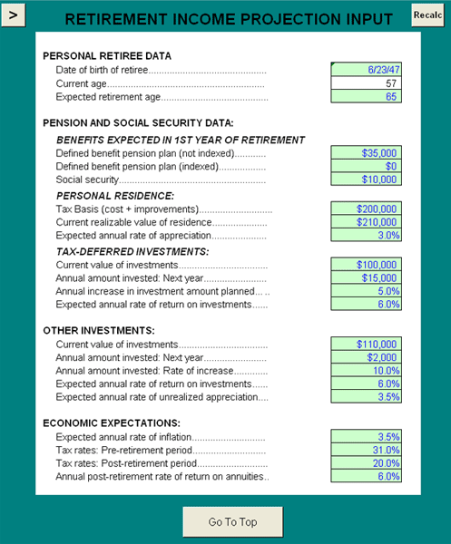 Retirement income projection input