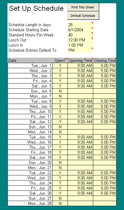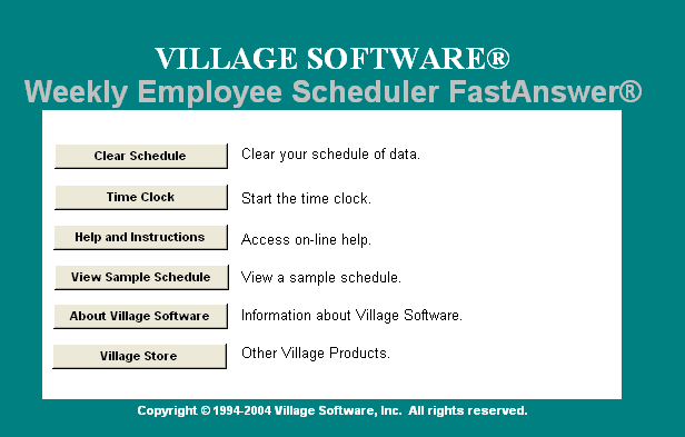 • The Weekly Employee Scheduler is completely button and menu-driven. You only need to input the numbers it needs to perform its calculations. You don't have to waste time entering any unnecessary information