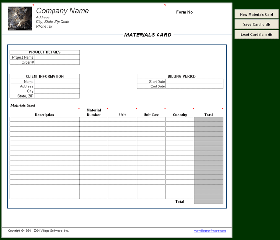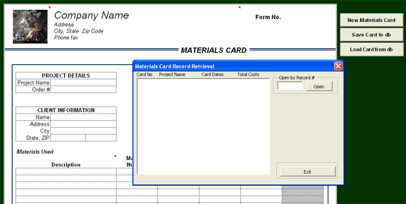 Materials card with database window