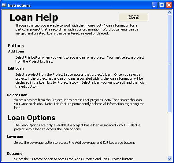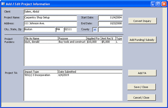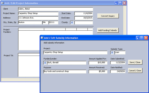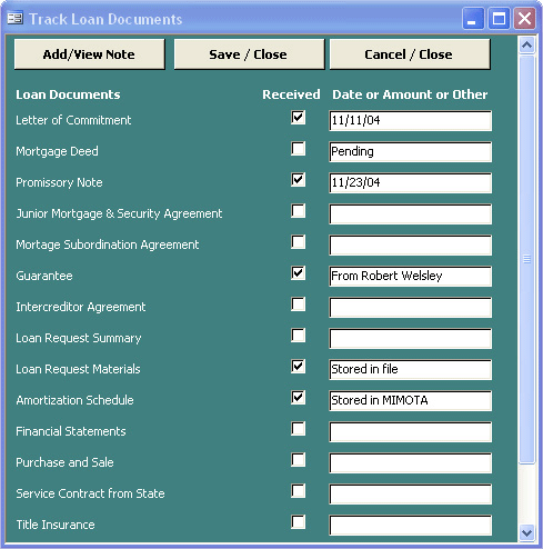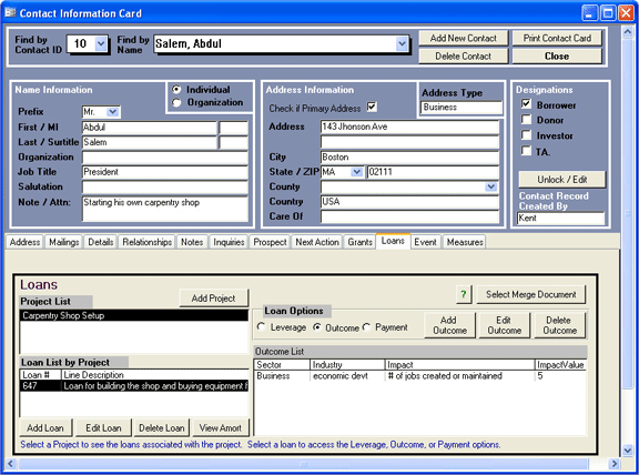 A client can have virtually unlimited projects and every project can have multiple loans associated. Through the friendly interface you can view the summary of all projects and also review specific loan information with the click of a few buttons. For example a client can have three loans for a business expansion project and one loan for a housing project. Money Out displays information on all four loans of this client and allows you to select a loan for further review.
